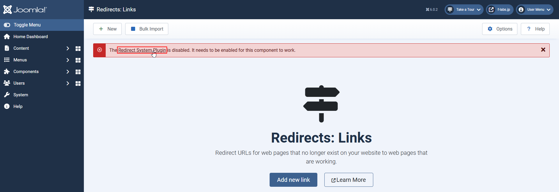 - "The Redirect System Plugin is disabled."のリンクをクリックします