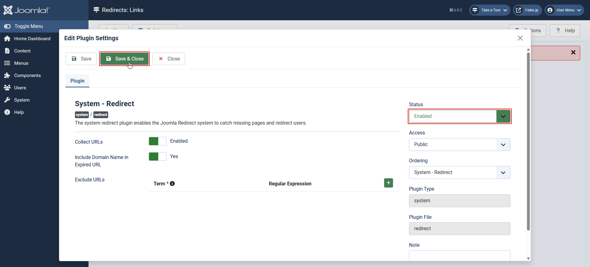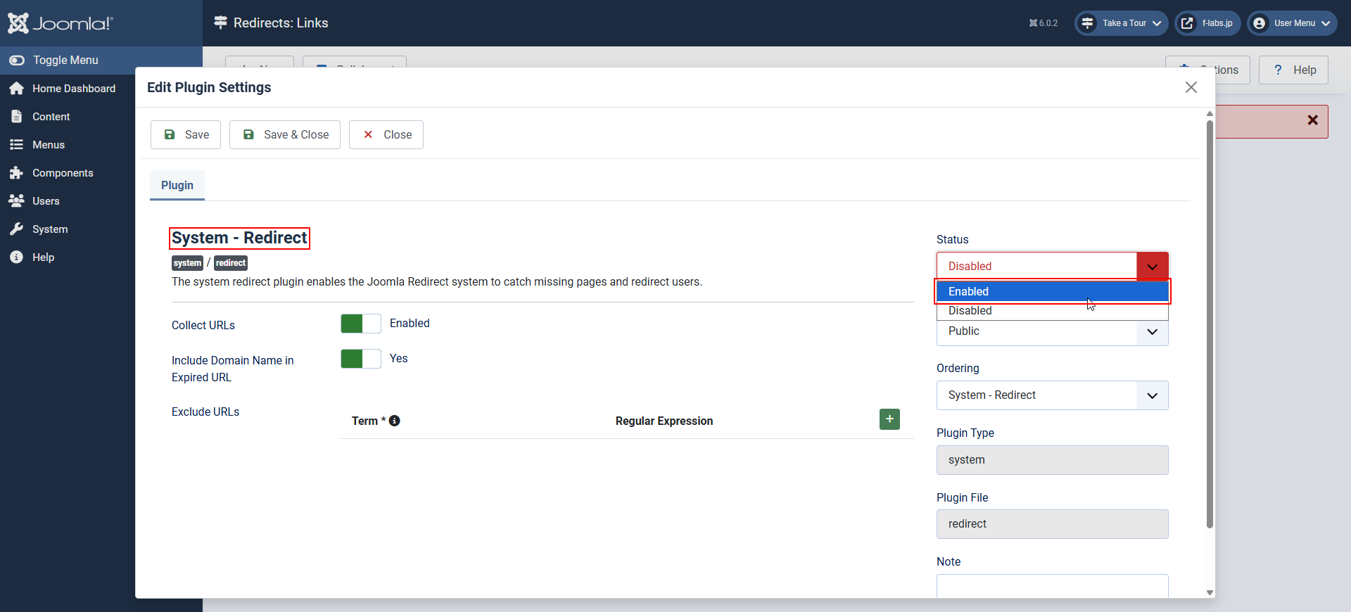 - Joomla!のRedirect Pluginの有効化