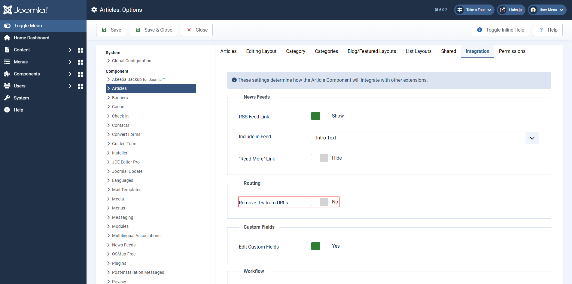 - Remove IDs from URLs: Noとオプションを変更すると、訪問者にとって意味のないArticle IDが付与されたURLとなってしまいSEF URLsの理想に反します