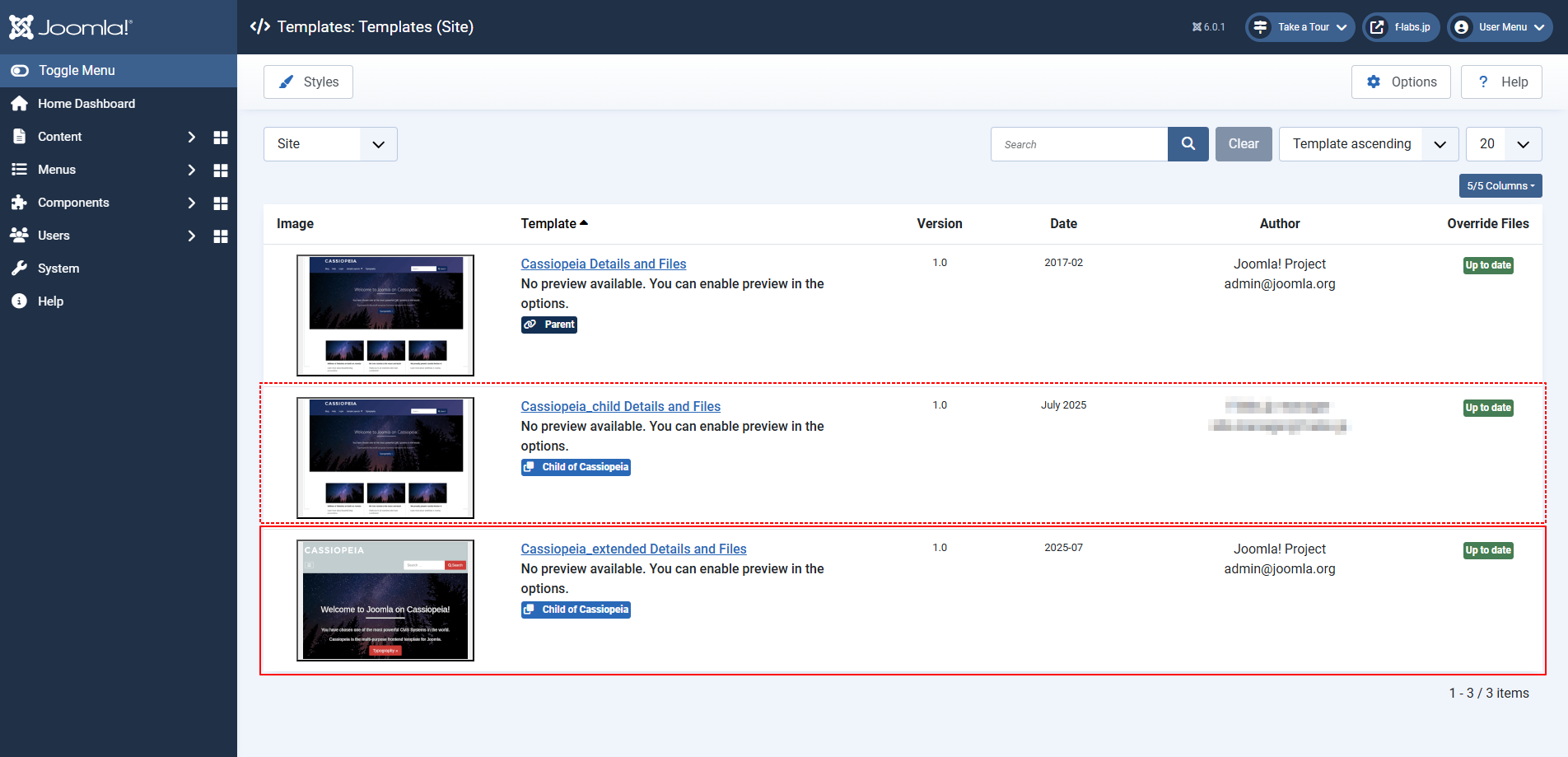 - 赤実線枠: Joomla! 6.0に同梱のCassiopeia Extended - Default Style