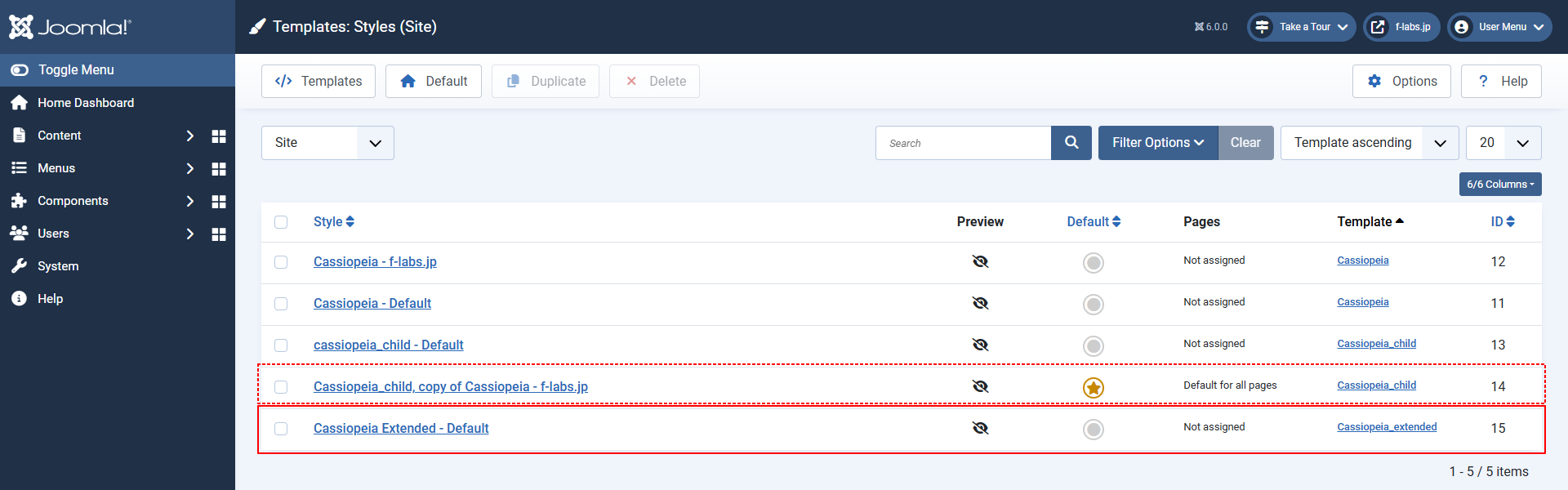 - 赤点線枠: Joomla! 5.4まで使用してきたCassiopeia_child, copy of Cassiopeia - f-labs.jp Style