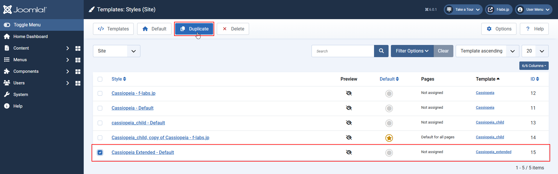 - オリジナルのCassiopeia_extended - Default Styleを複製し、Cassiopeia_extended - f-labs.jpと名前を変更します