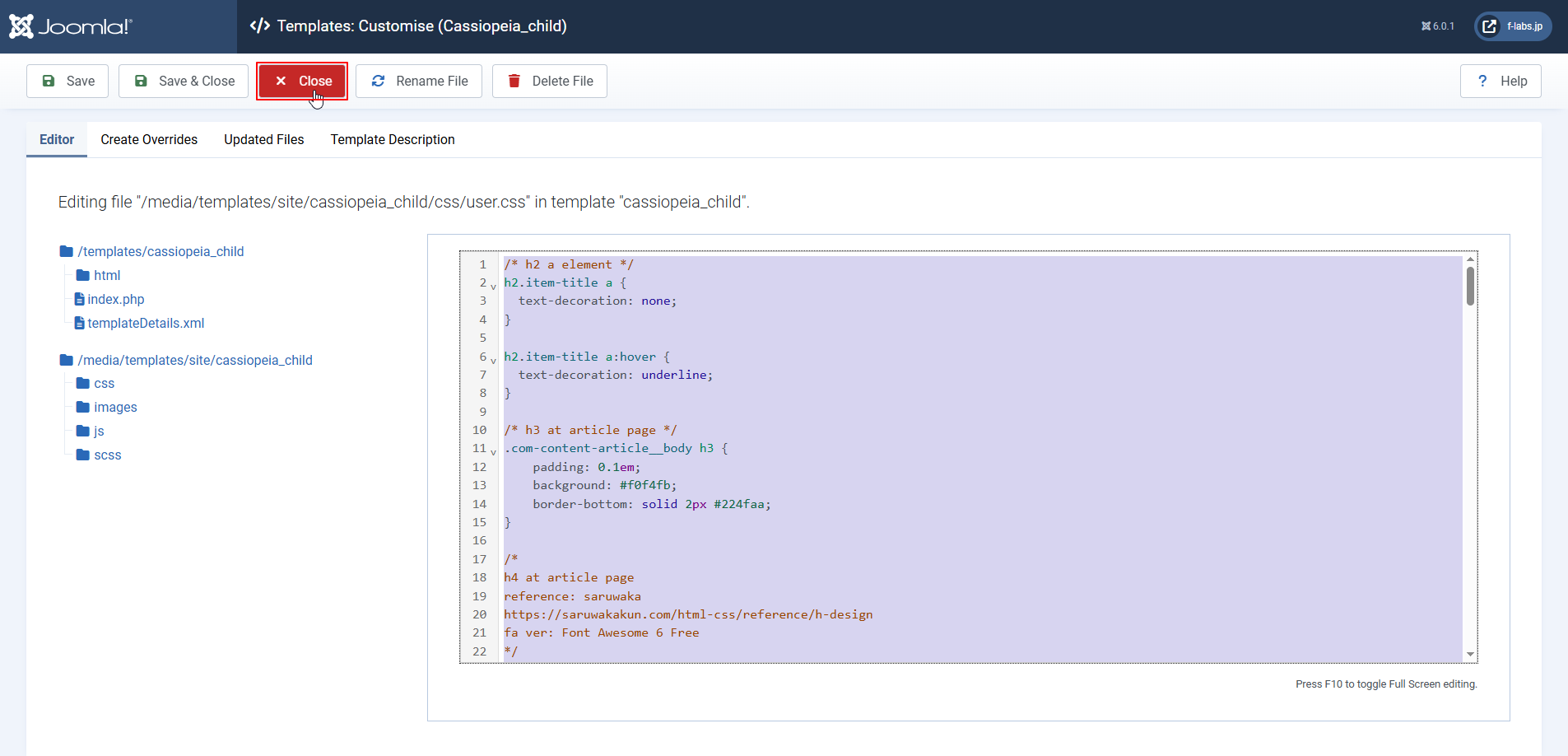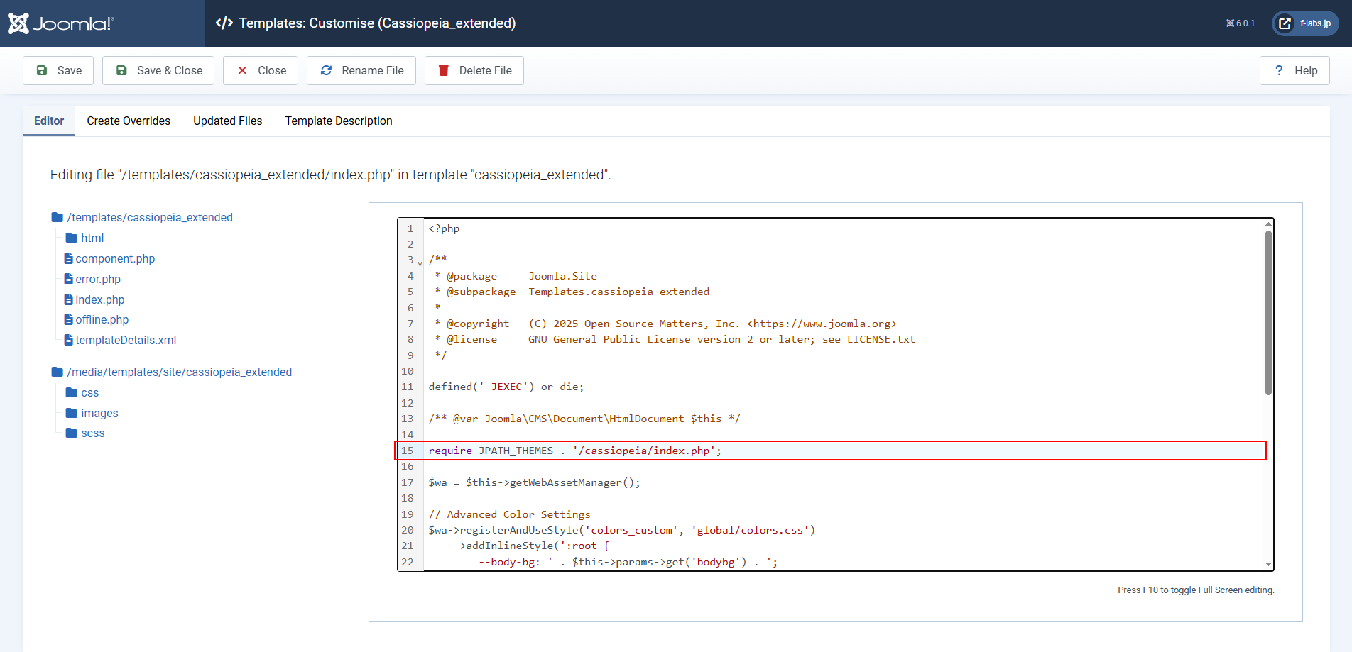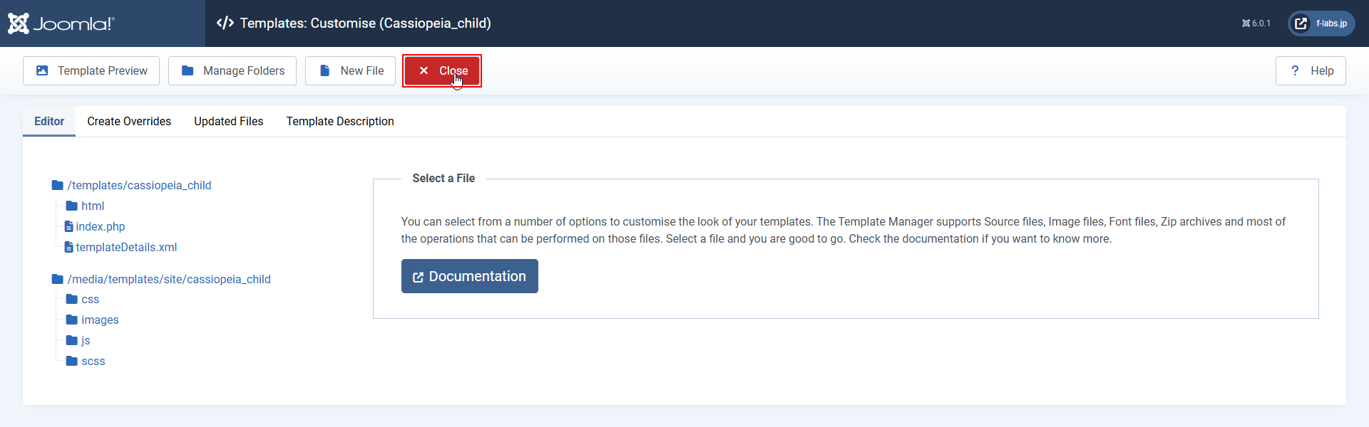 require JPATH_THEMES . '/cassiopeia/index.php'; ↓ require JPATH_THEMES . '/cassiopeia_child/index.php'; - Save & Closeをクリックします