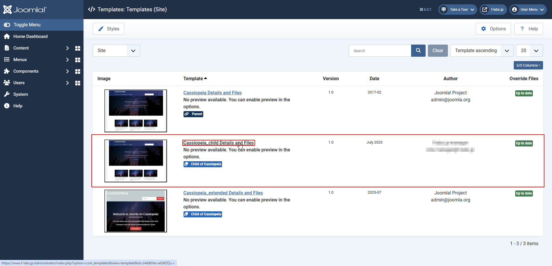 - System > Templates > Site Templates > Cassiopeia_child Details and Files