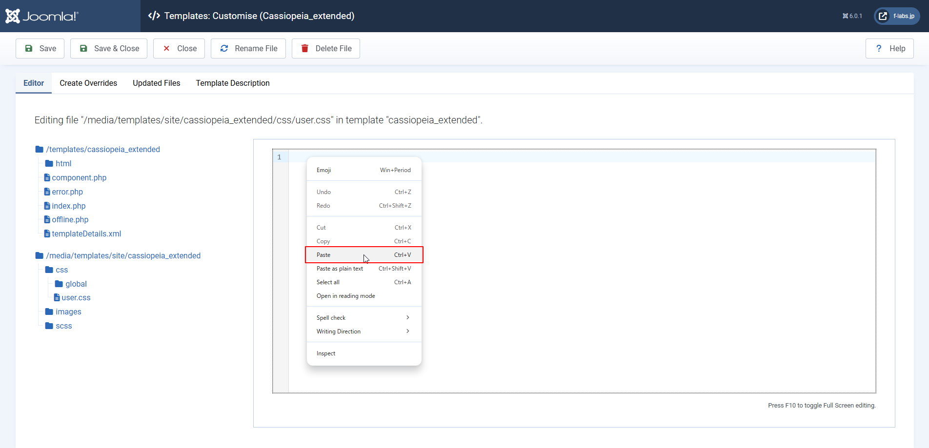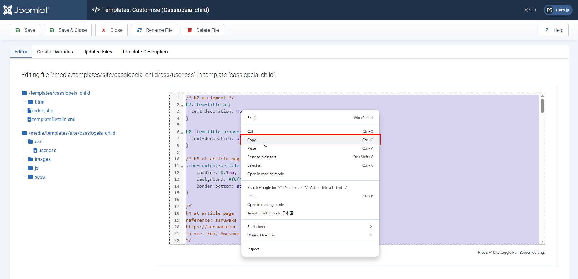 - 空のuser.cssにこれまで使用してきたChild TemplateのCassiopeia childのuser.cssをコピーして貼り付けます