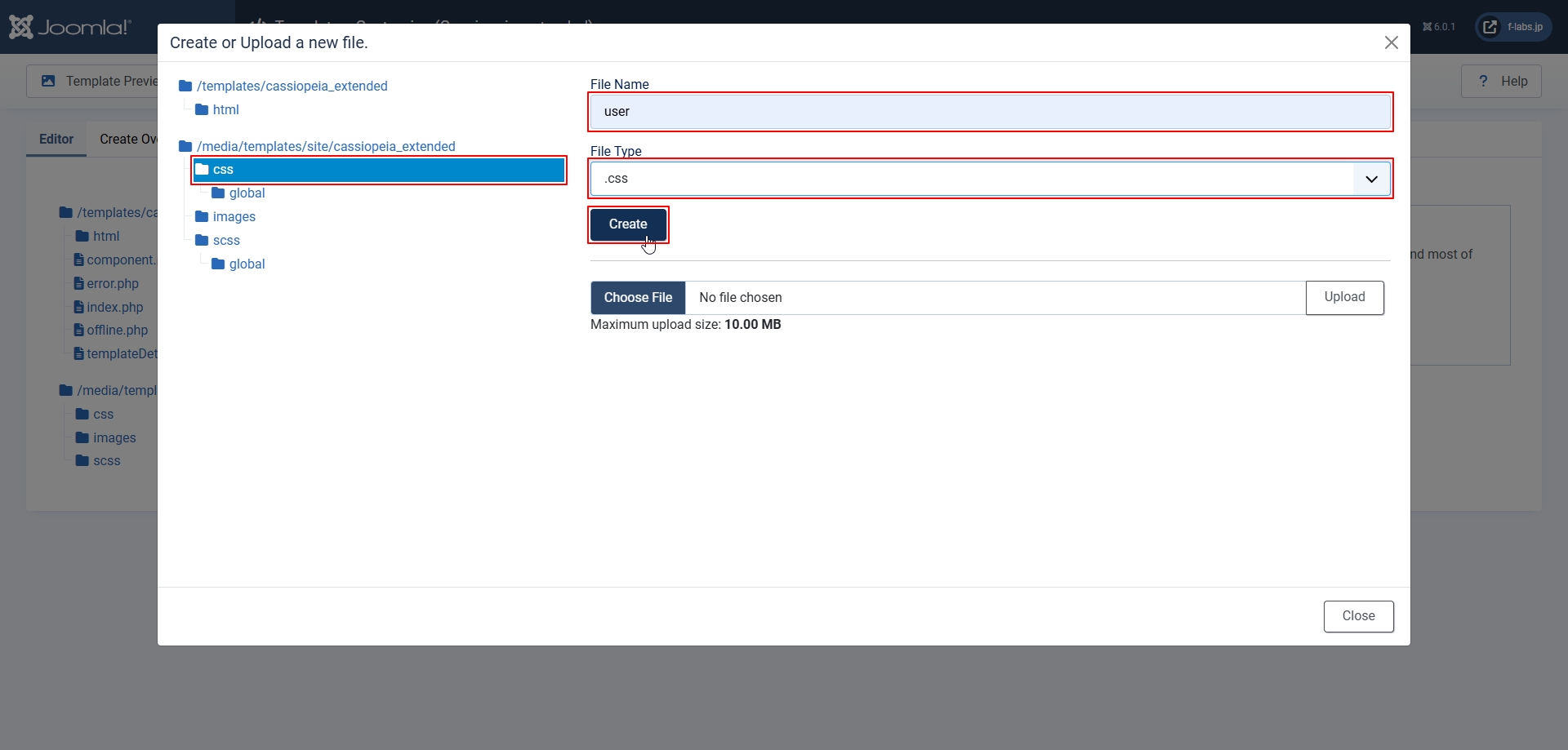 - そこで、Cassiopeia_extended Templateにuser.cssを作成し、Cassiopeia_child Templateのuser.cssの内容をコピーします