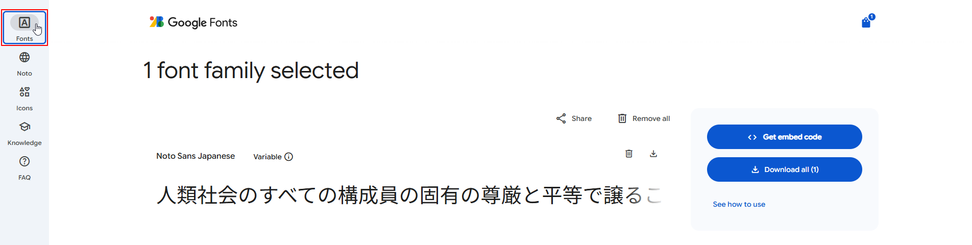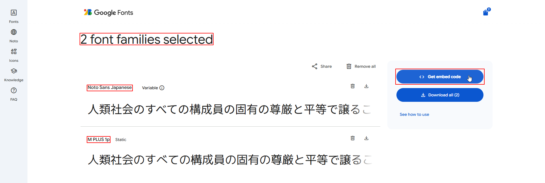 - [2 font families selected]のタイトルを確認し、左肩の[Get embed code]をクリックします