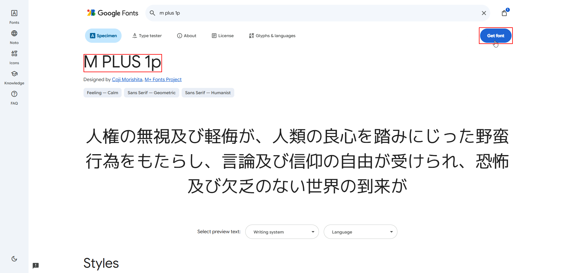 - M PLUS 1pを検索し、同様に[Get Font]をクリックします