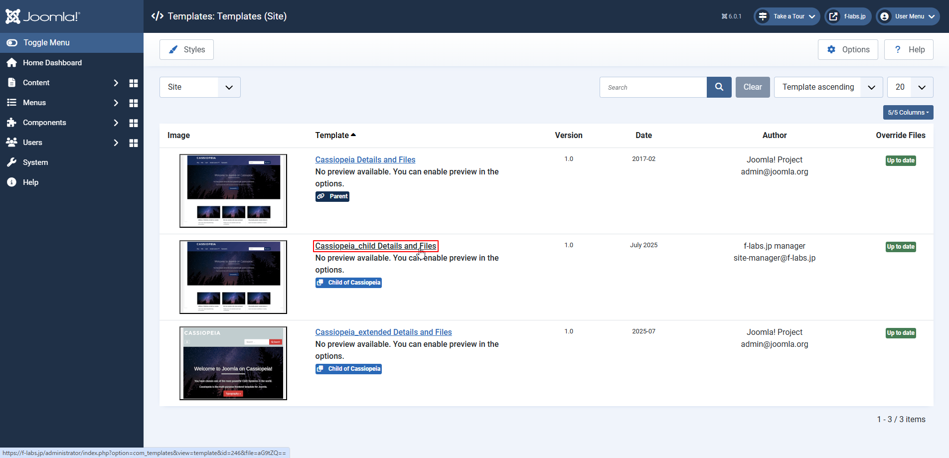- Home Dashboard > System > Template > Site Template > Cassiopeia_child Details and Filesをクリックします