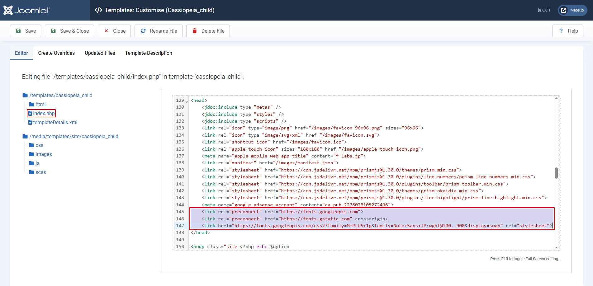 - Editor tab > /templates/cassiopeia_child/index.phpをクリックします