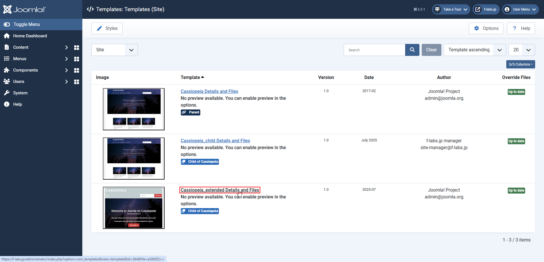 - Home Dashboard > System > Template > Site Template > Cassiopeia_Extended Details and Filesをクリックします