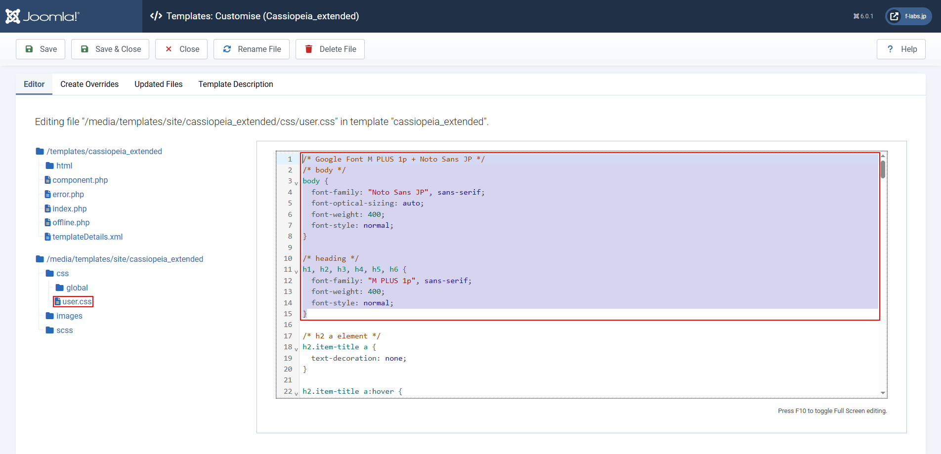 - Editor tab > /media/templates/site/cassiopeia_extended/css/user.cssをクリックします
