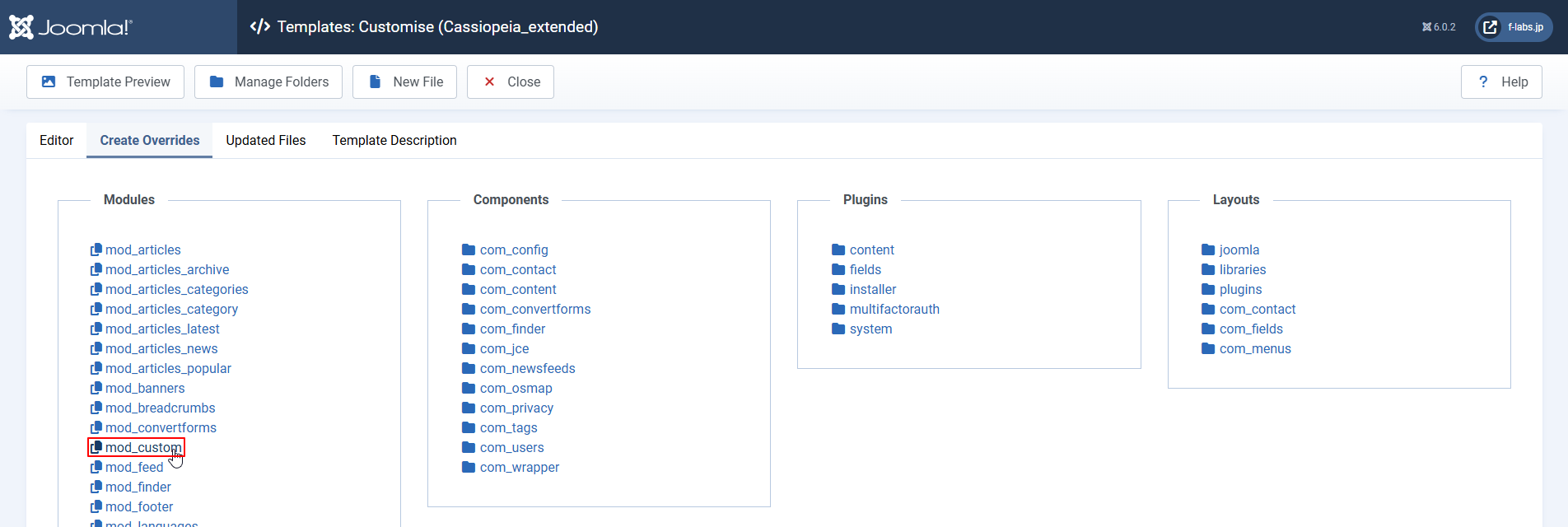 - Create Overrides tab > Modules blk > mod_customをクリックしてOverrideを作成します