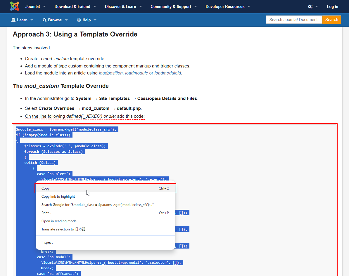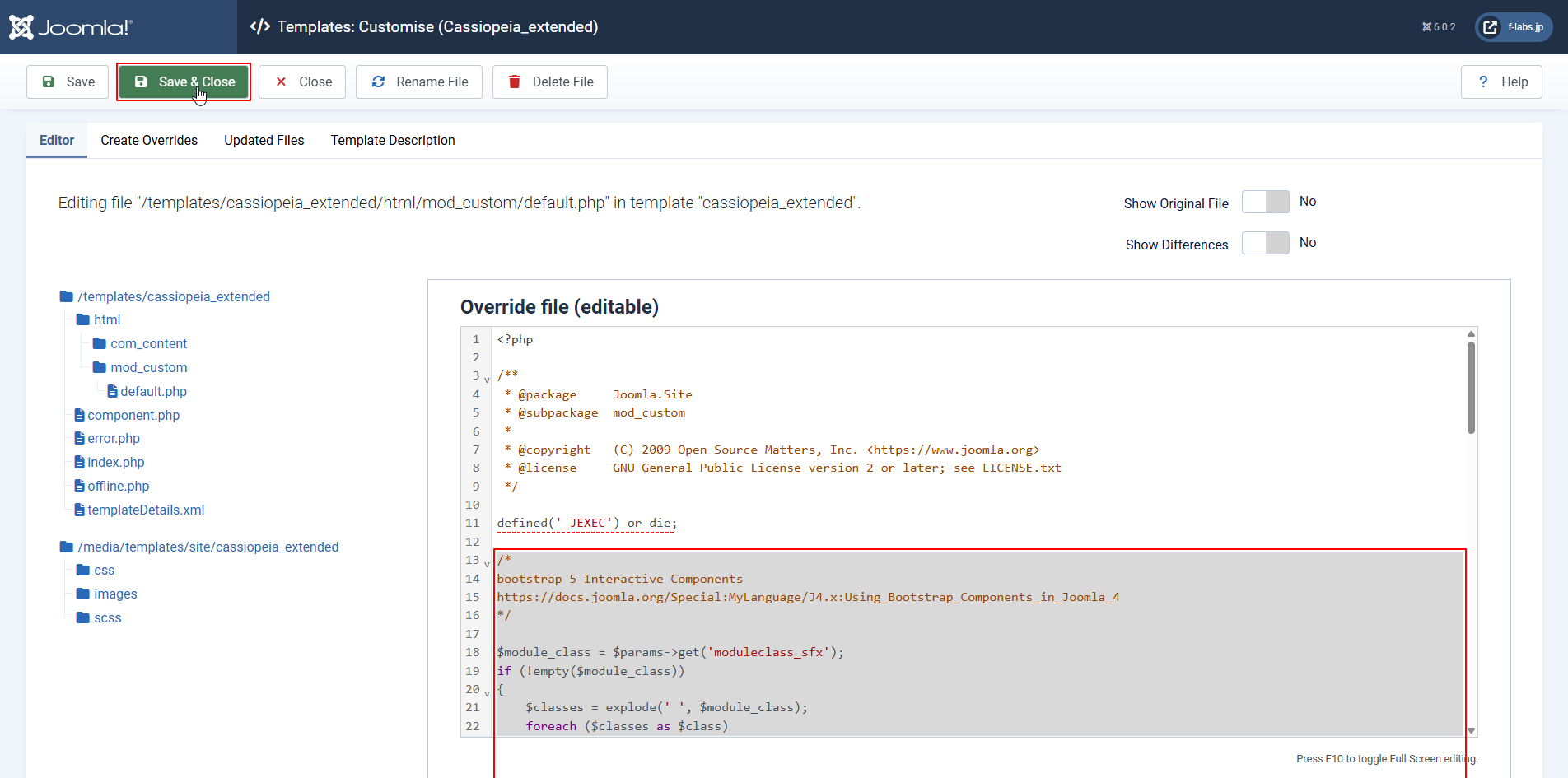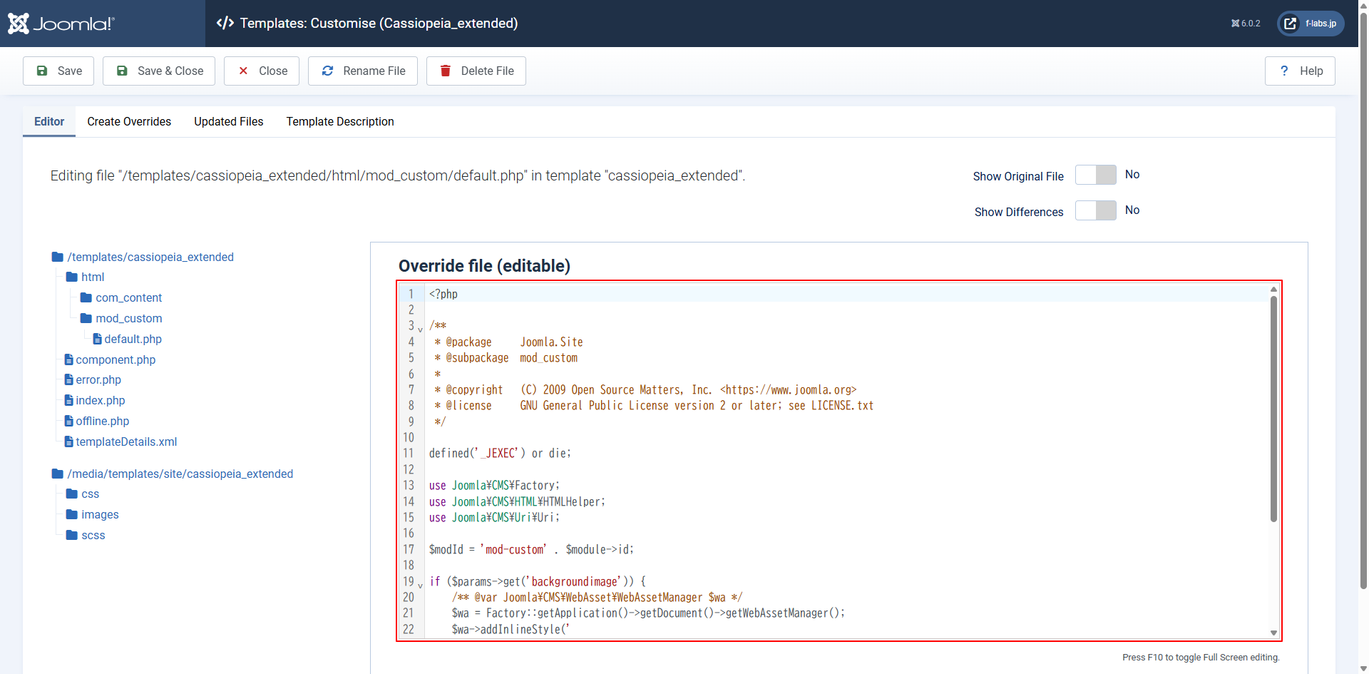 - Editor tab > /templates/cassiopeia_extended/html/mod_custom/default.phpをクリックします