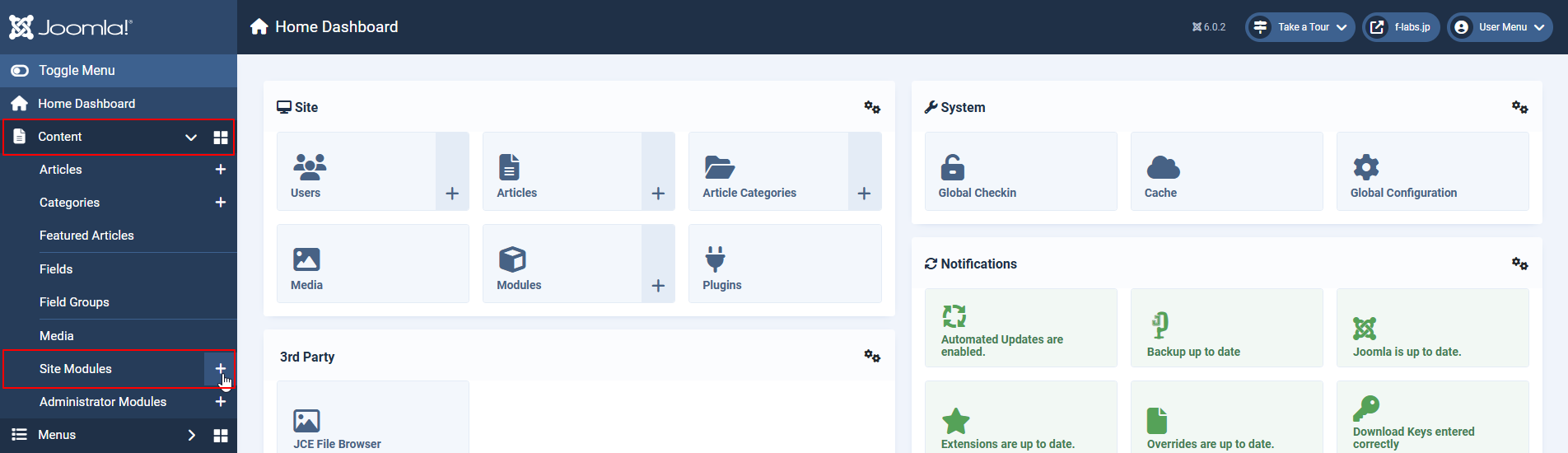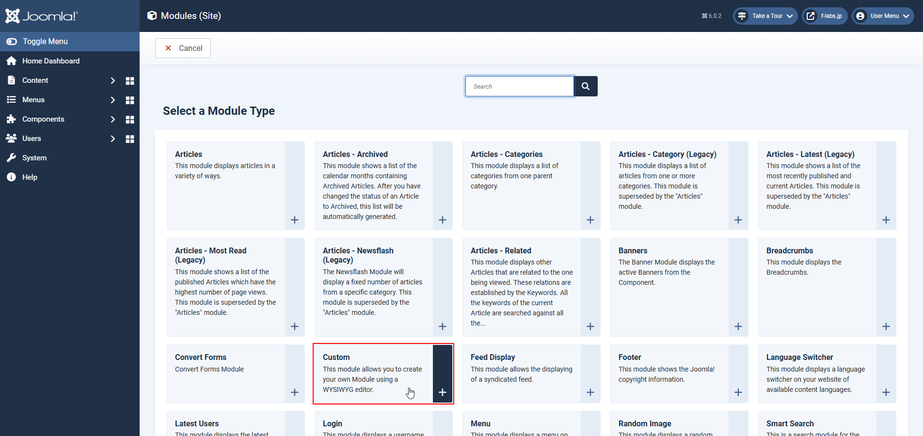 - Content > Site Module右の+をクリックします