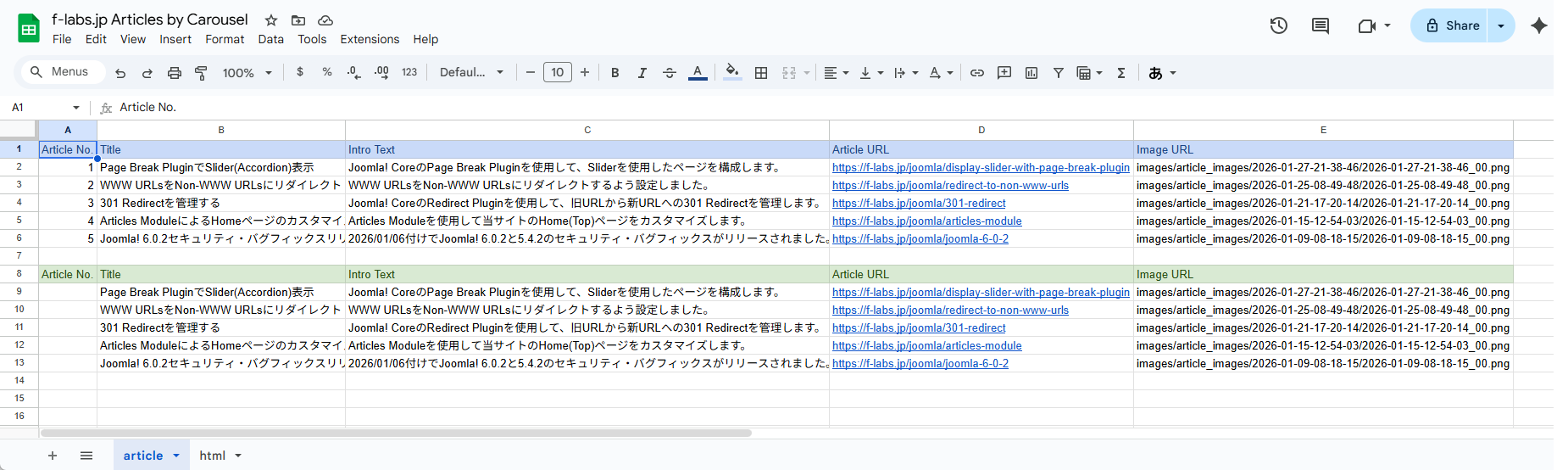 - Sheet: articleの緑色のタイトル行以下(L9~)にArticleの情報(Article Title, Intro Text, Article URL, Image URL)を入力します