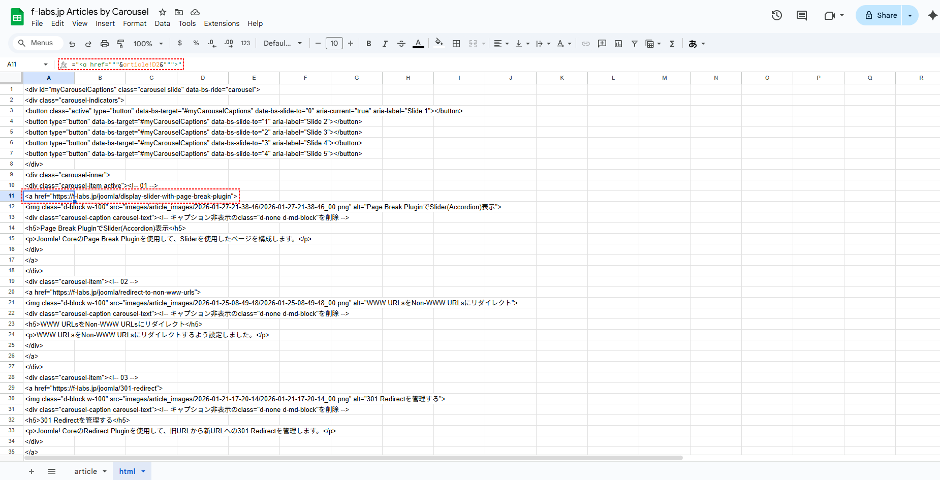 - Sheet: htmlにSheet: articleの水色のタイトル行以下(L2~L6)のArticle情報をセル参照で構成されたCarouselのhtmlコードが表示されます