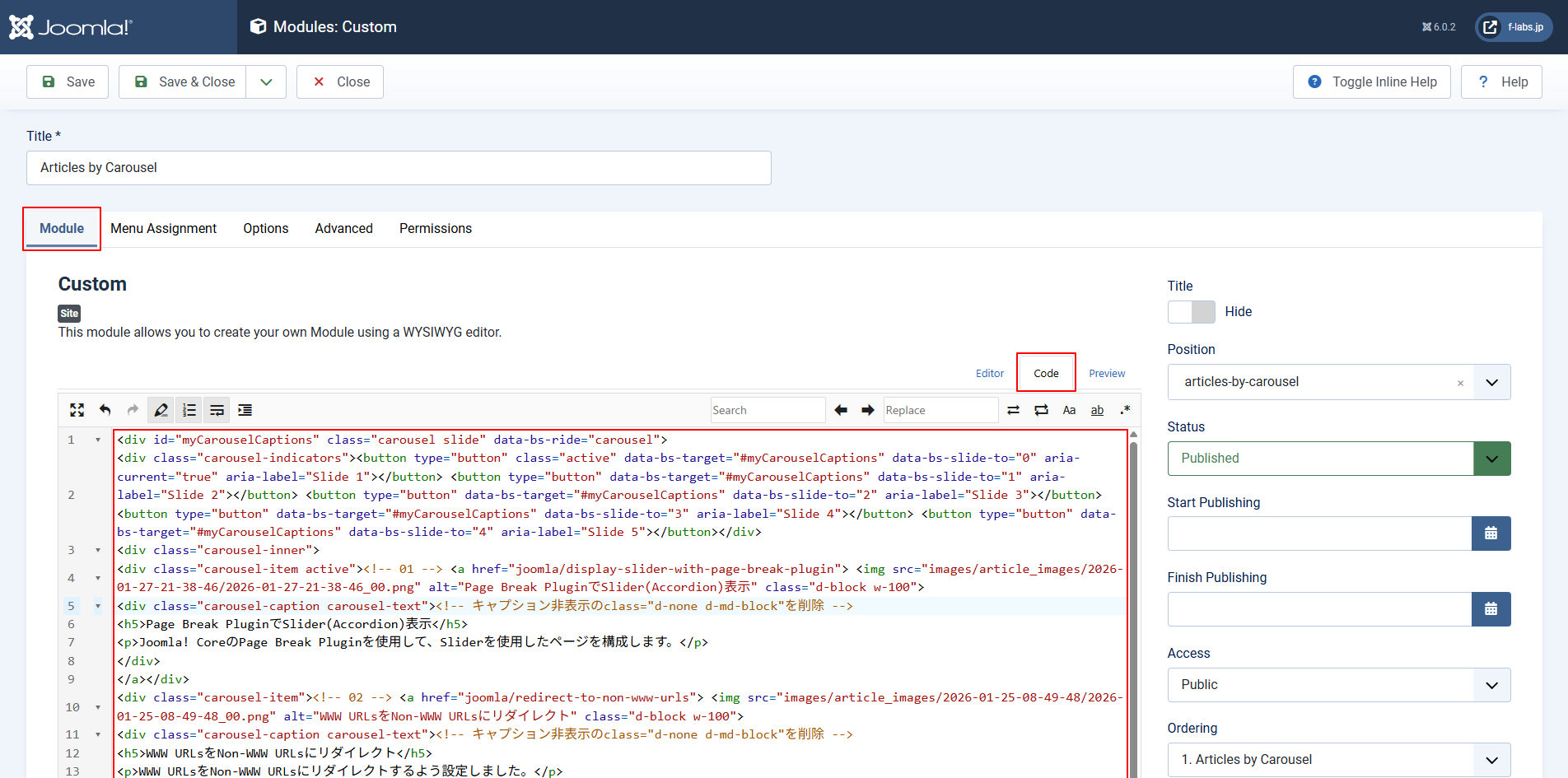 - なお、[CarouselのSite Moduleを作成 手順6]に記載したHTMLコードは上記修正を施したものになります