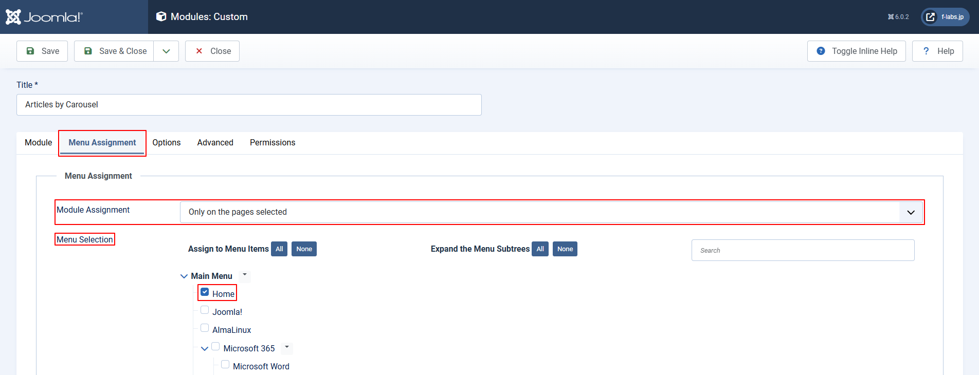 - Module Assignment: Only on the pages selectedを指定します