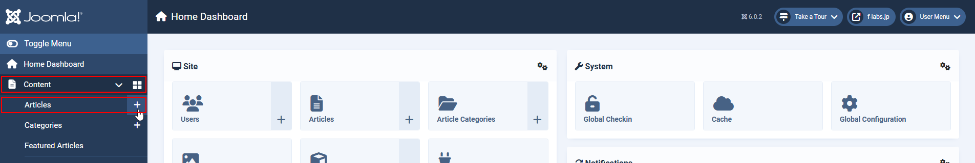 - Content > Articles右の+をクリックします