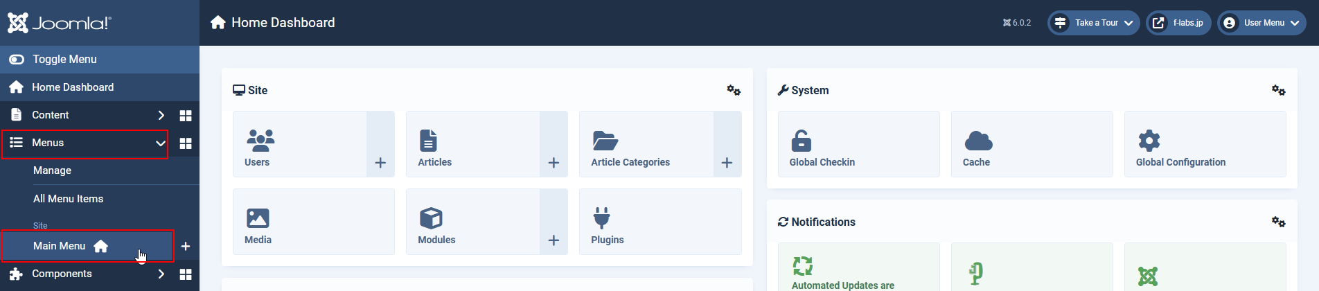既設のHomeを編集する場合: Menus > Main Menuをクリックし、Menus: Items (Main Menu)からHomeをクリックします