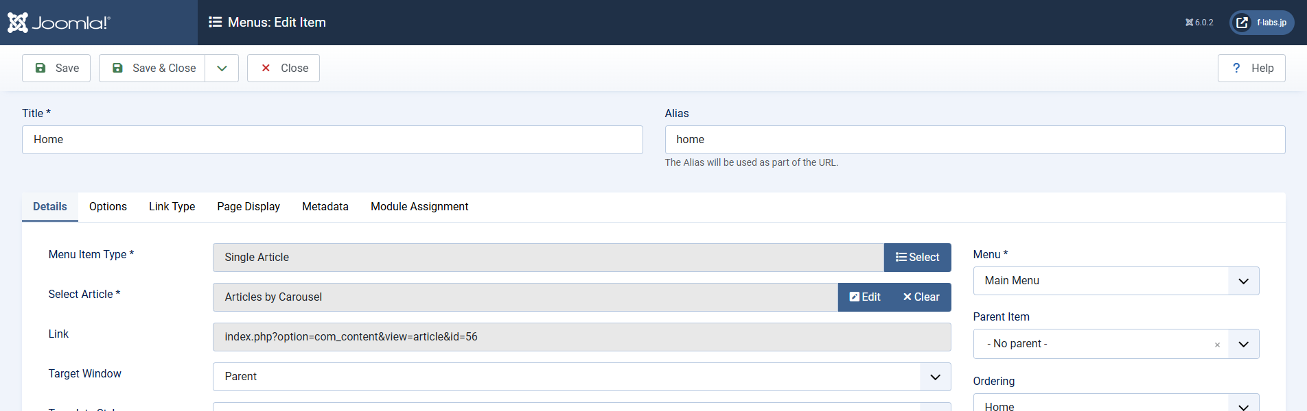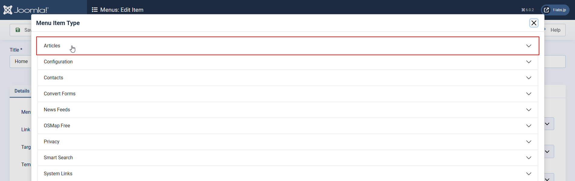 - Details tab > Menu Item Type: 編集前のFeatured Articlesから変更するためSelectをクリックします