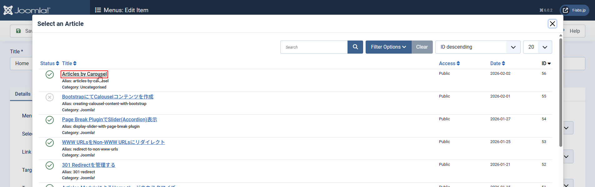 - Menu: HomeにMenu Type: Single Article - Select Article: Articles by Carouselが指定されました