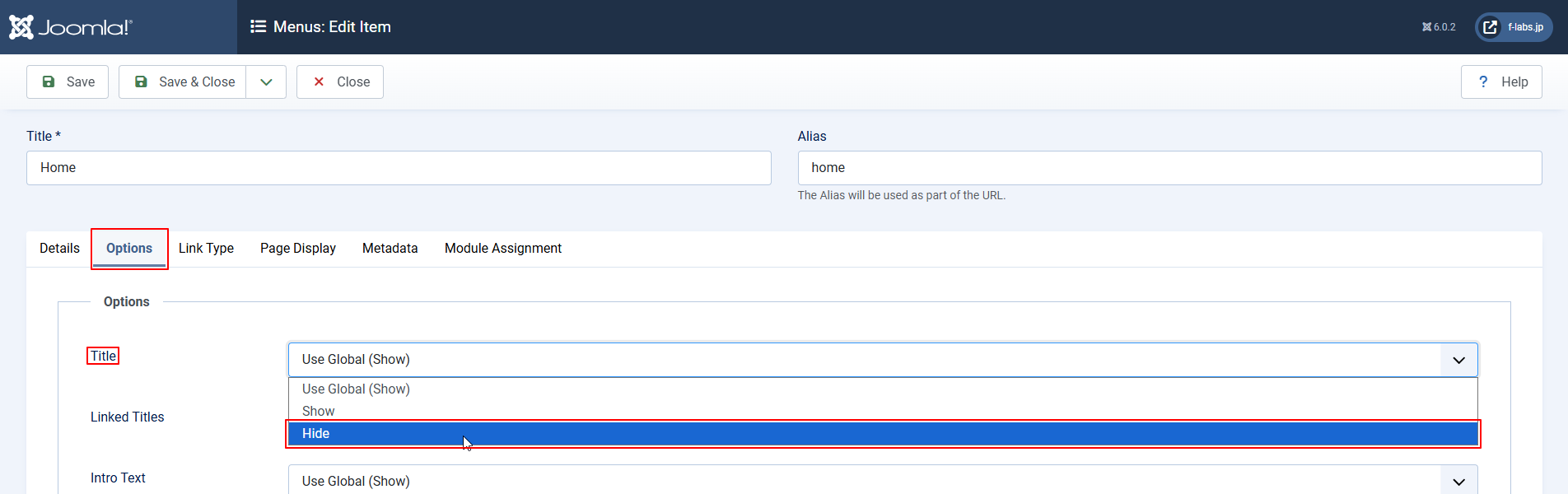 - Title: Use Global (Show)からHideに変更します