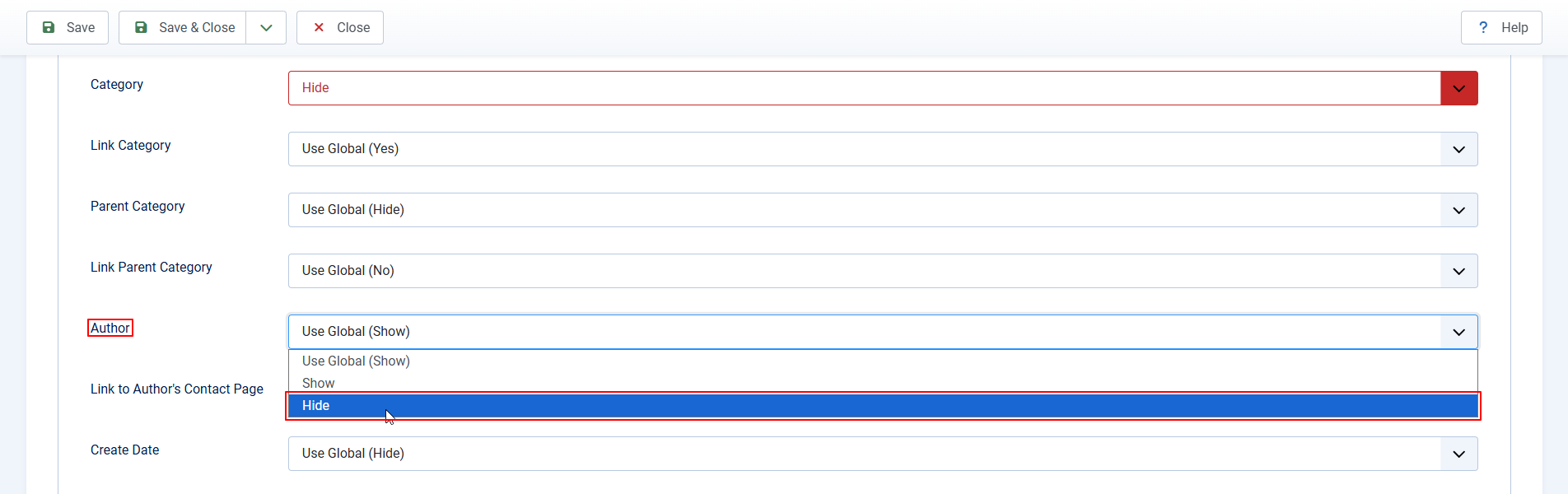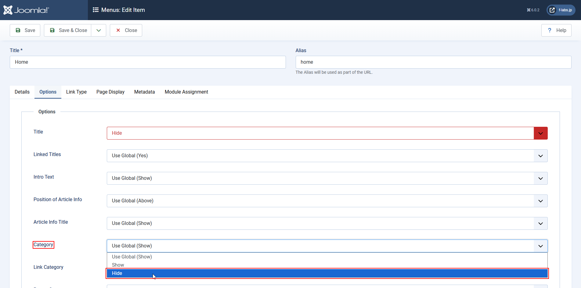 - Category: Use Global (Show)からHideに変更します