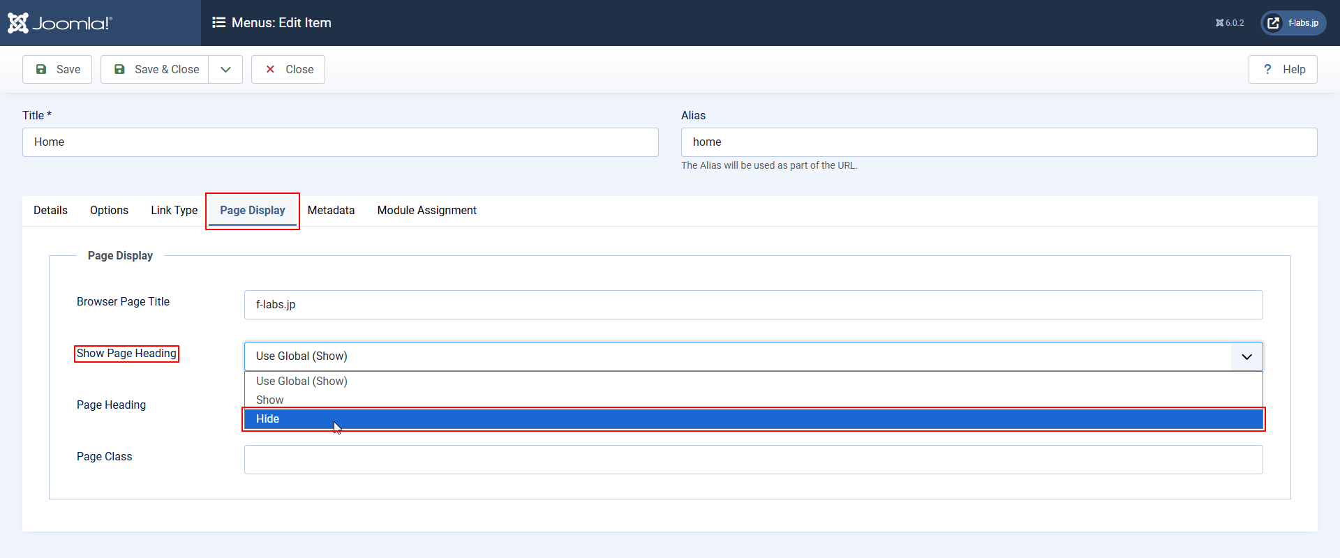 - Show Page Heading: Use Global (Show)からHideに変更します